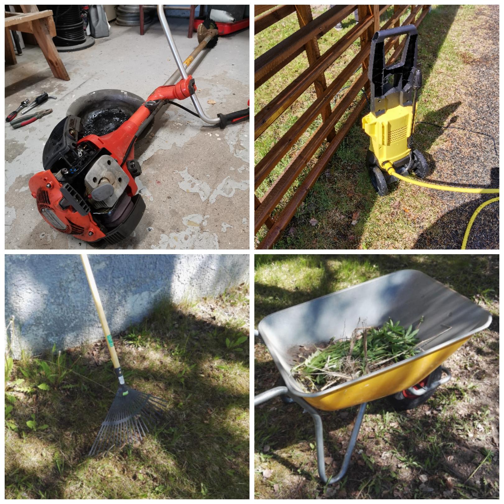 Työvälineinä lapiot, haravat, rautakanki, leka, ajettava ja työnnettävä ruohonleikkuri, moottorisaha, raivaussaha, kirves, vesuri, normaalit käsityökalut, akkukäyttöiset porakone, katkaisulaikka.