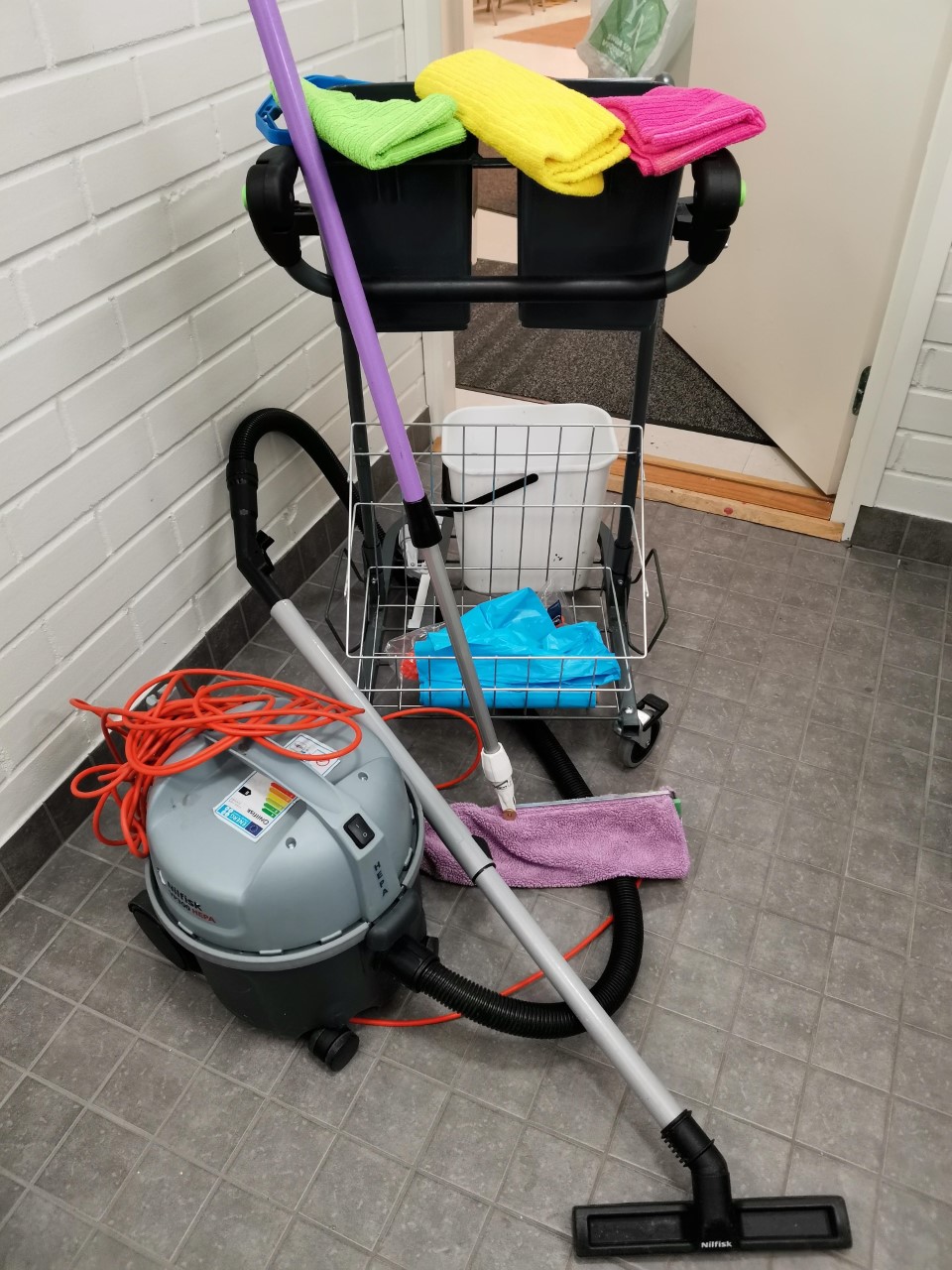 Välineistö: imuri, lattiamoppi, pyykkikone, värikoodatut siivousliinat (vihreä: yleiset tilat, pöydät ja tasot, ovenkahvat, valokatkaisimet, keltainen: wc-tilat, punainen: wc-istuin) Siivousaineet: yleispesuaine,