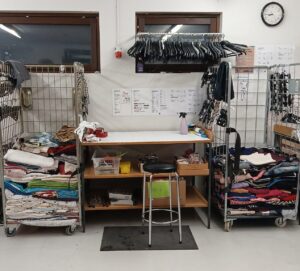 Tuotantotiloista löytyvä työpiste, jonka äärellä käsitellään lahjoituksena tulleita tuotteita.