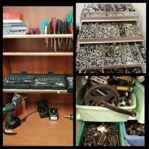 Käytössä on yleisemmät polkupyörien korjaukseen tarvittavat pientyökalut, korjausteline, ilmapainekompressori, rengastyökaluja.