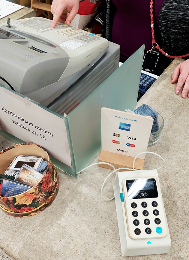 SaimaanVirta ry:n kierrätysmyymälässä ovat käytössä iZettle-maksukortinlukija ja tablettitietokone, jossa on iZettle-sovellus. Kassapääte on Casio SE-S400.