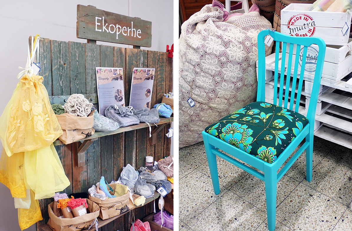 SaimaanVirta ry:n työpajatuotteita, joita valmistetaan ja kunnostetaan kierrätetyistä materiaaleista.