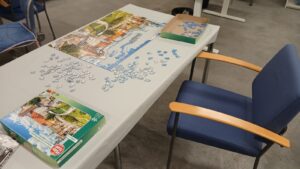 Palapeli, joka on tarkastuksessa. Siitä tarkistetaan, että kaikki palat ovat tallella ja toimitetaan sitten Goodwilliin myyntiin.