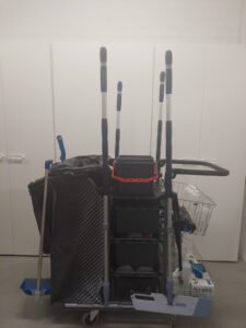 Puhtaanapidon välineistöä, tässä siivouskärryt.