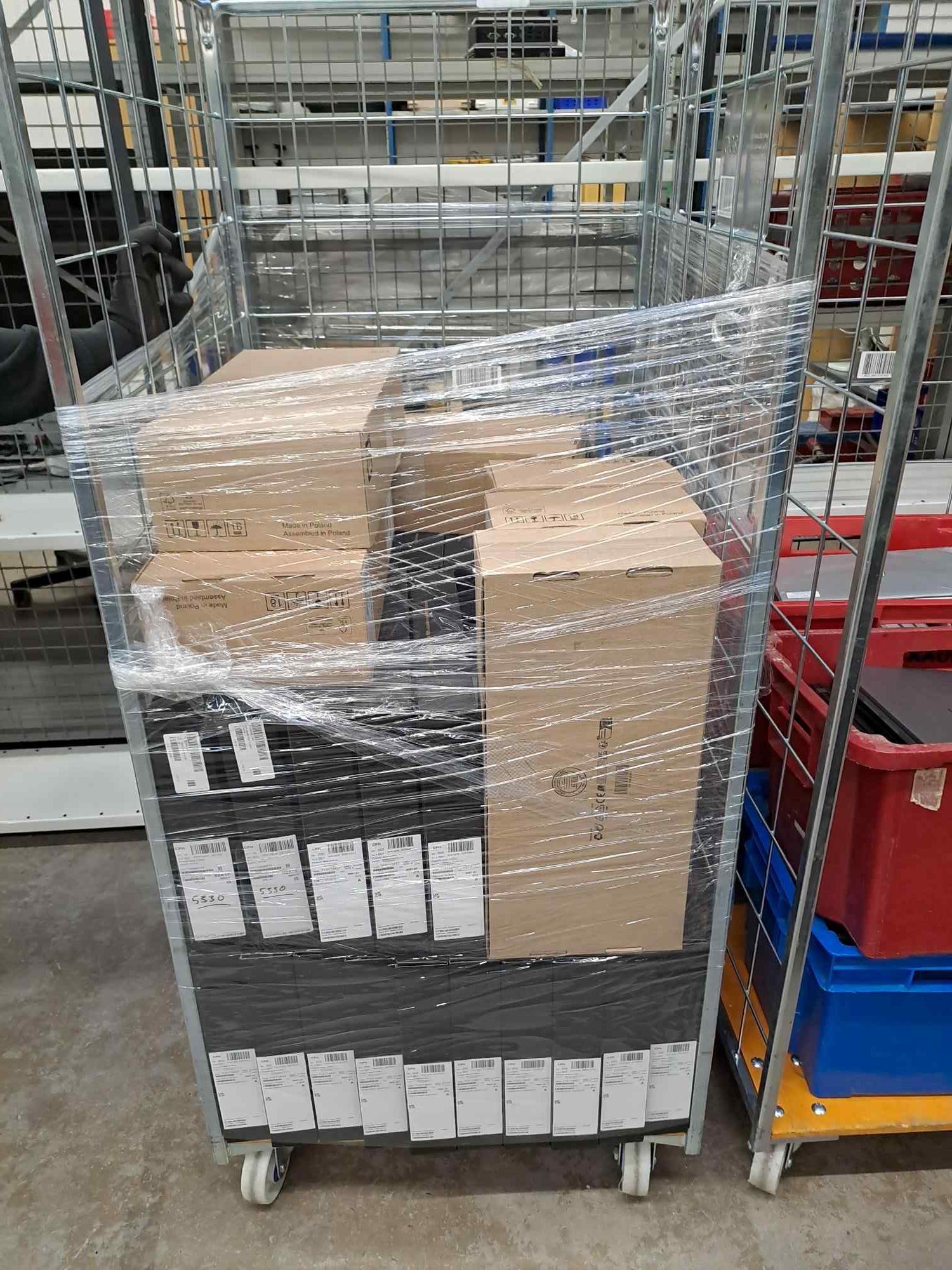 - Rullakot varastoidaan varastotilaan, josta asiakkaat noutavat koneita purettavaksi.