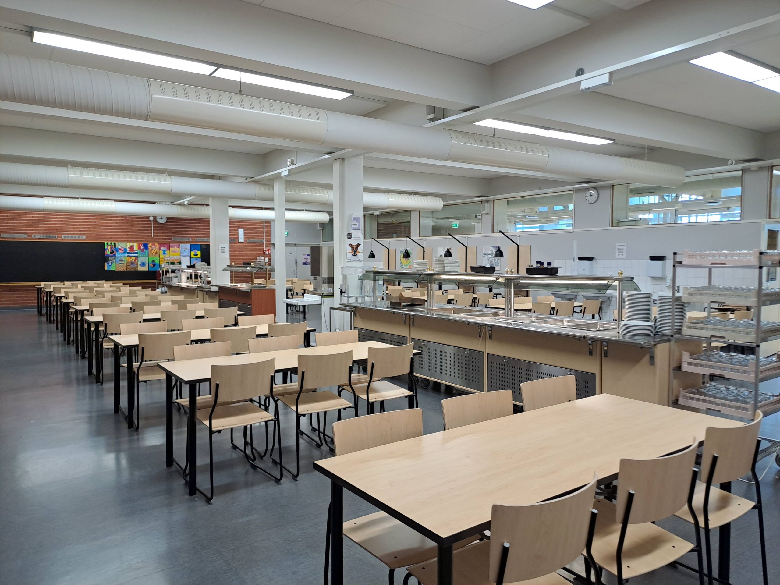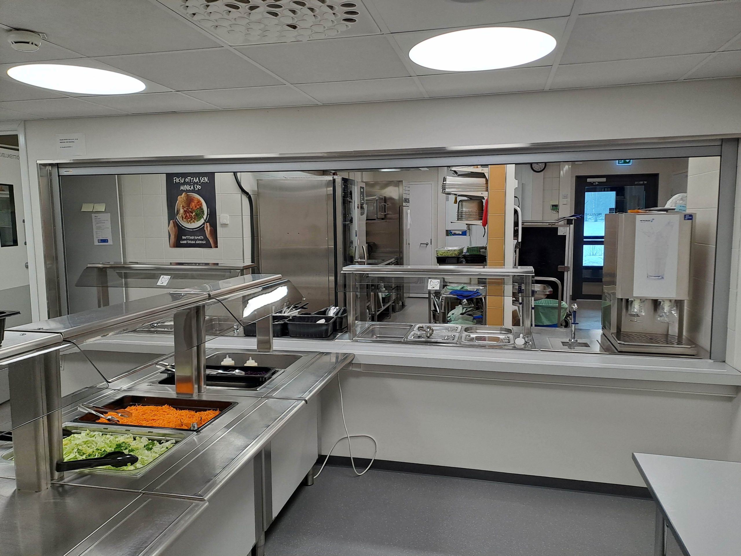 Palvelukeittiössä vastaanotetaan ja tarjoillaan keskuskeittiöstä tullut valmis ruoka. Aikataulun mukainen työskentely ja työtehtävien merkityksen hahmottaminen tulee näkyväksi tässä työympäristössä, jossa ruokailee suuri määrä lapsia, oppilaita ja henkilökuntaa. Osa ruoasta valmistetaan/paistetaan omassa keittiössä, jotta voidaan varmistaa ruoan laatu koko ruokailun ajan. Ruoka on vaihtuvan lounaslistan mukaista ja siinä on huomioitu ravitsemussuositukset. Energialisäkkeet keitetään/valmistetaan itse. Erityisruokavalioiden osalta edellytetään tarkkuutta, kuten myös yleisten hygieniasäädösten noudattamisessa ja esimerkiksi puhdistusaineiden oikeaoppisessa annostelussa. Keittiössä työskennellään ammattimaisissa työasuissa. Työjakson aikana perehdytään sekä astiahuoltoon että sali-/linjastotyöskentelyyn. Työ edellyttää jätteiden oikeaoppista lajittelua. Työturvallisuuden huomioiminen esimerkiksi koneiden ja laitteiden käytössä, tavaroiden siirrossa ja ergonomisessa työskentelyssä on tärkeää, sillä tehtävät ovat tarkasti aikataulutettuja suuren ruokailijamäärän vuoksi. Ruokailijoiden huomioiminen asiakaspalveluhenkisesti ylläpitää hyvää ilmapiiriä. Asiakaspalvelutilanteita tulee myös tähderuoan myynnissä sekä rahastuksessa. Koulukeskuksella tarjotaan kahdesti vuodessa vaihtuvan lounaslistan mukaista ruokaa. Listassa on huomioitu ravitsemussuositukset. Kasvisvaihtoehto kuuluu joka ateriaan.